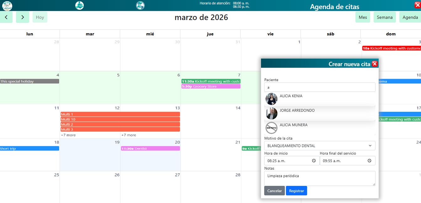 A través de un calendario interactivo con vistas diaria, semanal y mensual, el sistema facilita la creación, modificación y seguimiento de citas, permitiendo asociar pacientes, definir el motivo de la consulta, establecer horarios y registrar observaciones.