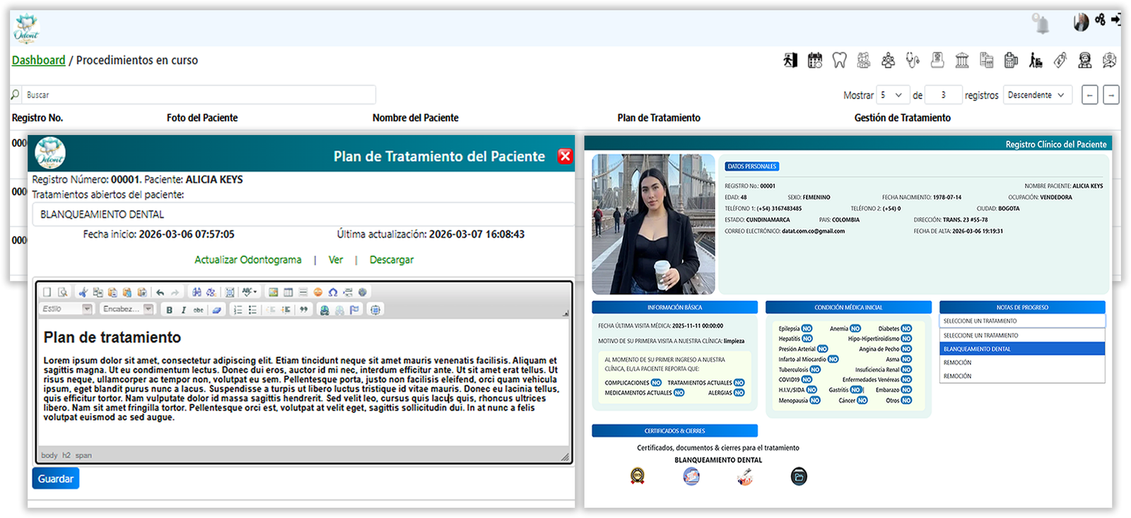 A través de este sistema se puede registrar, consultar y actualizar historias clínicas, almacenar antecedentes médicos y odontológicos, así como realizar el seguimiento de tratamientos, procedimientos y evolución del paciente.