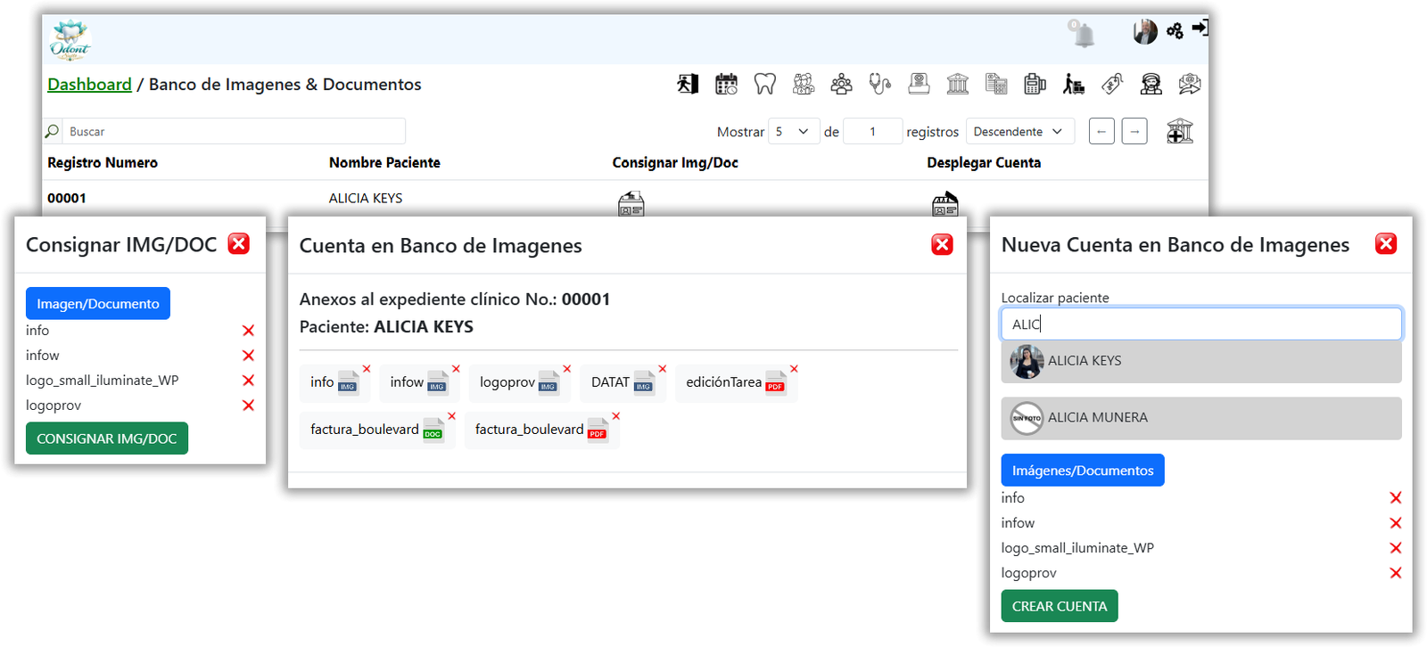 El módulo de Banco de Imágenes & Documentos de Odonto Suite ha sido diseñado para centralizar, organizar y gestionar de manera eficiente todos los archivos clínicos asociados a los pacientes. Este espacio permite a los profesionales de la salud almacenar imágenes diagnósticas, documentos administrativos y cualquier otro archivo relevante dentro del historial clínico digital.