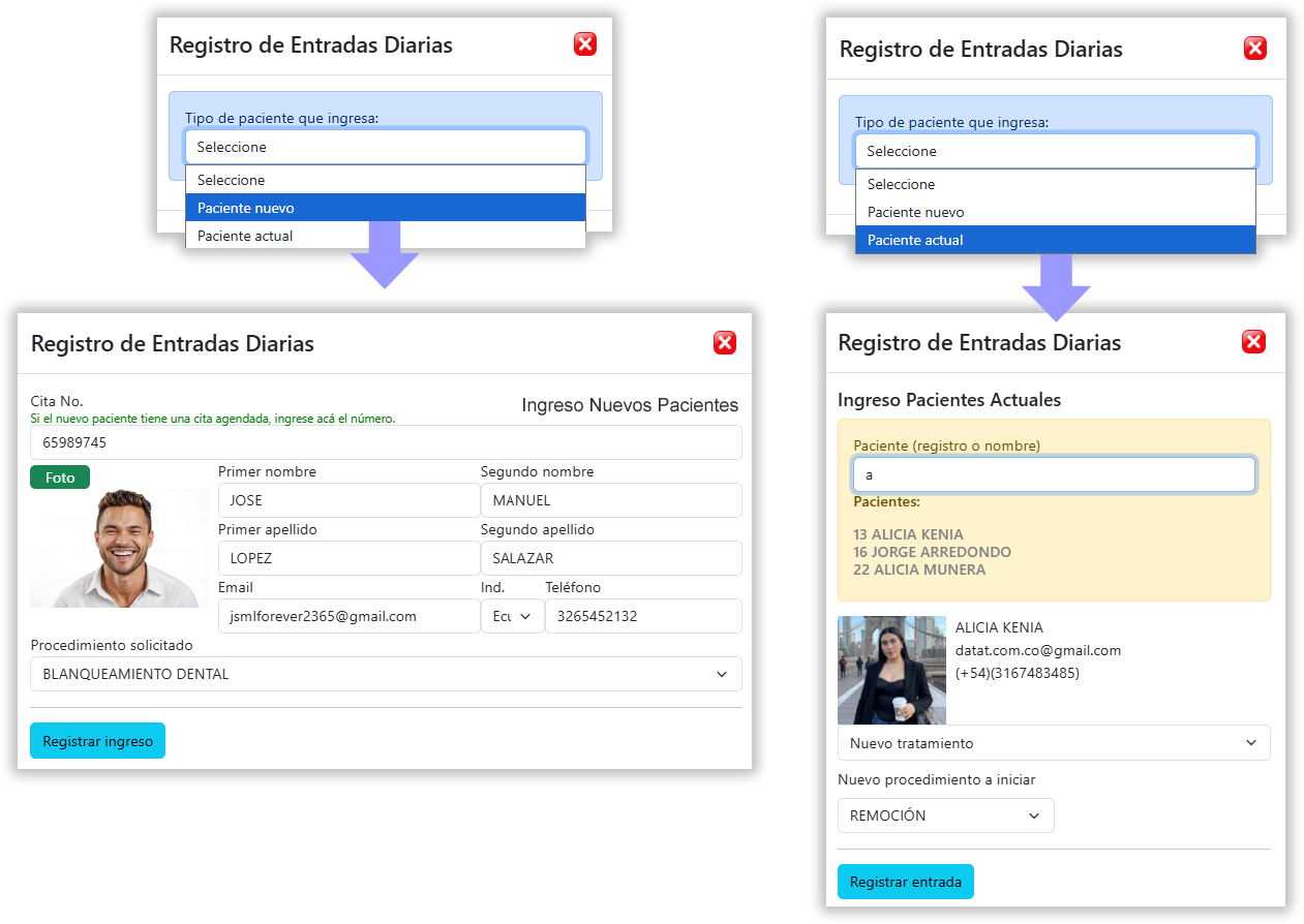 El sistema registra tanto pacientes nuevos como pacientes actuales, facilitando su identificación, captura de datos y asignación del procedimiento o tratamiento correspondiente.