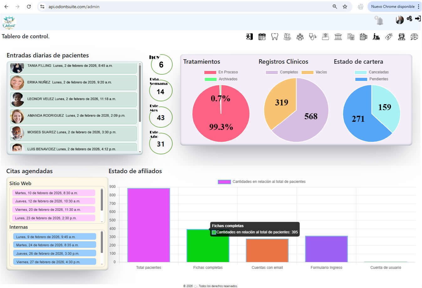 A través de métricas visuales e indicadores clave, permite monitorear el flujo de pacientes, las entradas diarias, semanales, mensuales y anuales, así como el estado de tratamientos, registros clínicos y cartera.