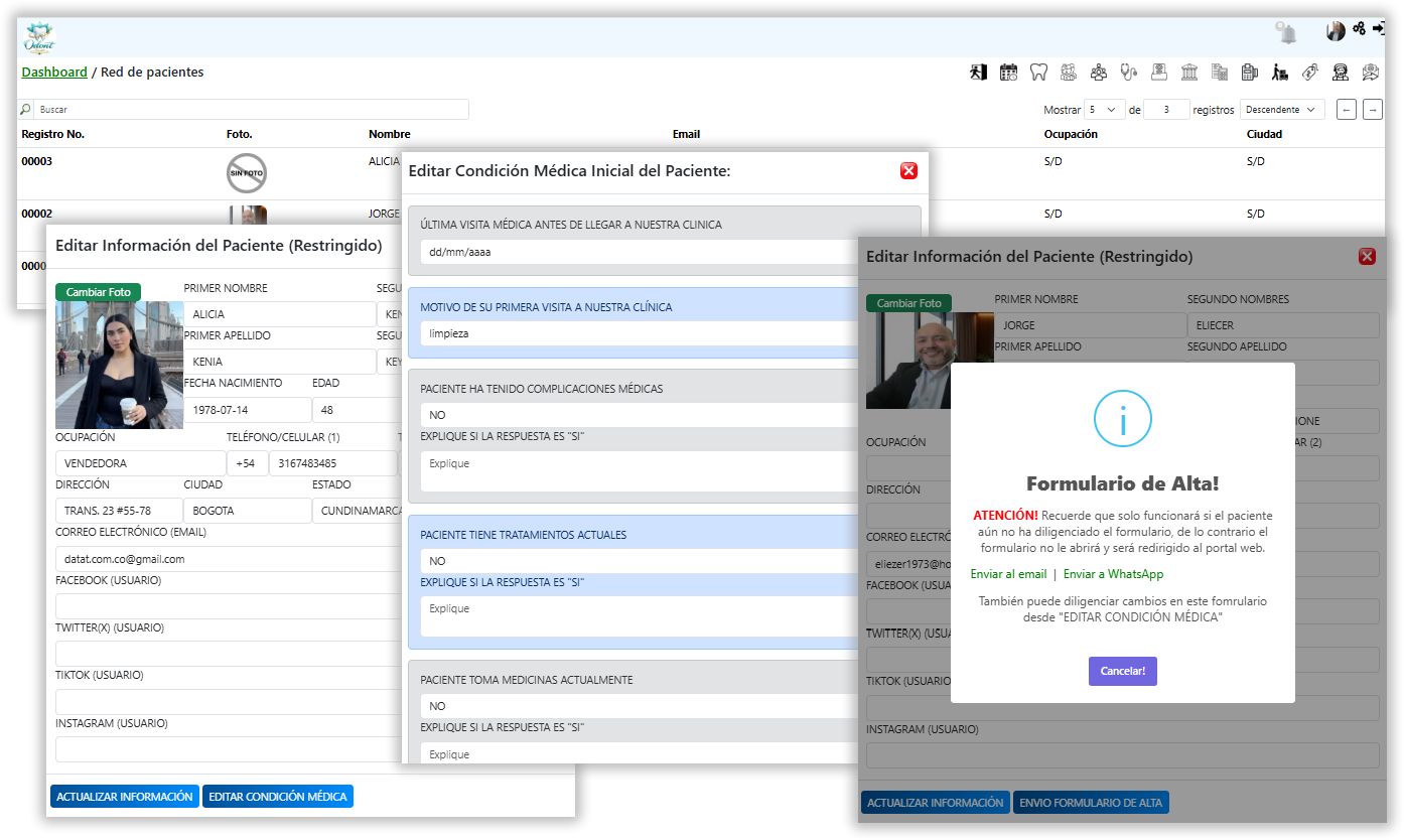 A través de este sistema se puede registrar, consultar y actualizar historias clínicas, almacenar antecedentes médicos y odontológicos, así como realizar el seguimiento de tratamientos, procedimientos y evolución del paciente.