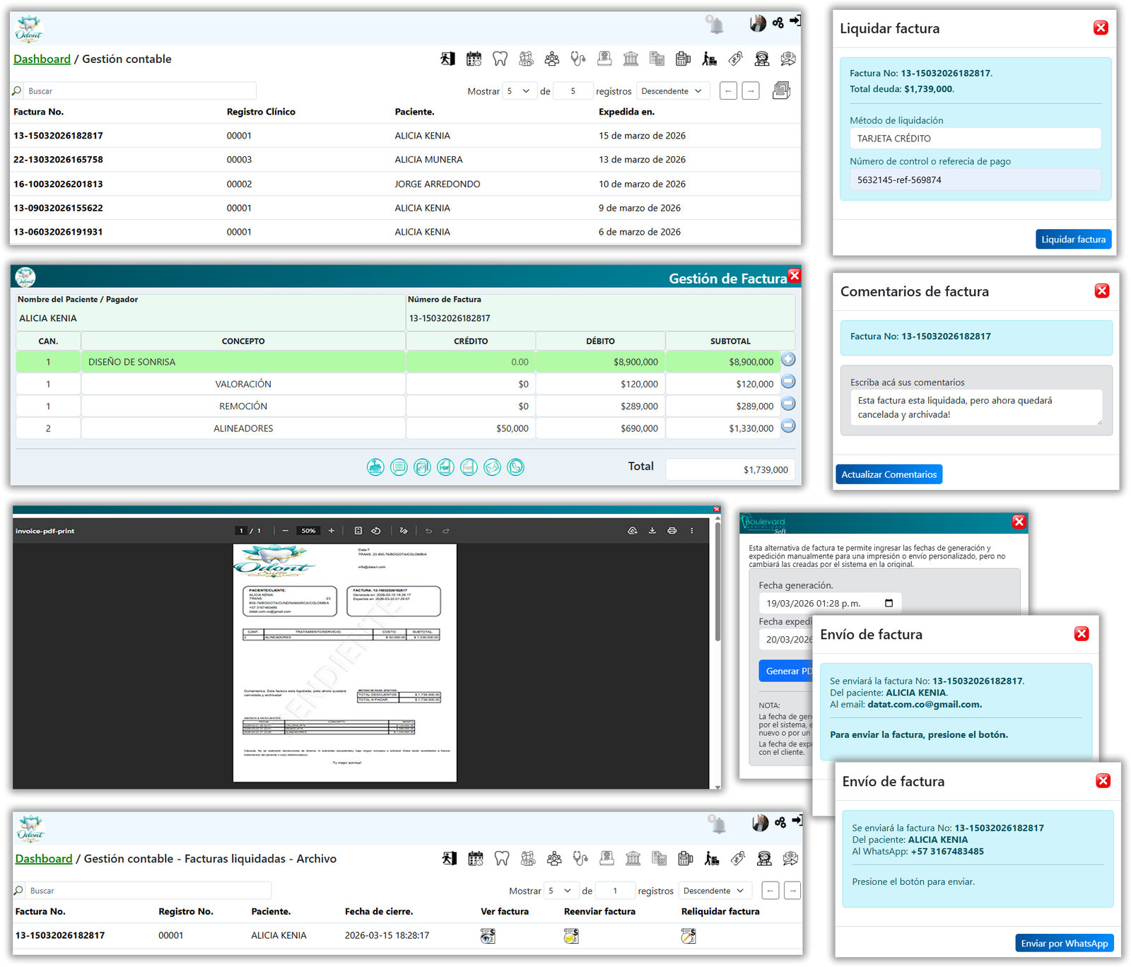 El módulo también incluye funcionalidades clave como la edición de comentarios, la impresión de facturas, el envío por correo electrónico o WhatsApp, y el almacenamiento automático en el historial de facturas liquidadas. Todo esto permite optimizar los procesos administrativos, reducir errores manuales y mejorar la experiencia tanto del personal como del paciente.