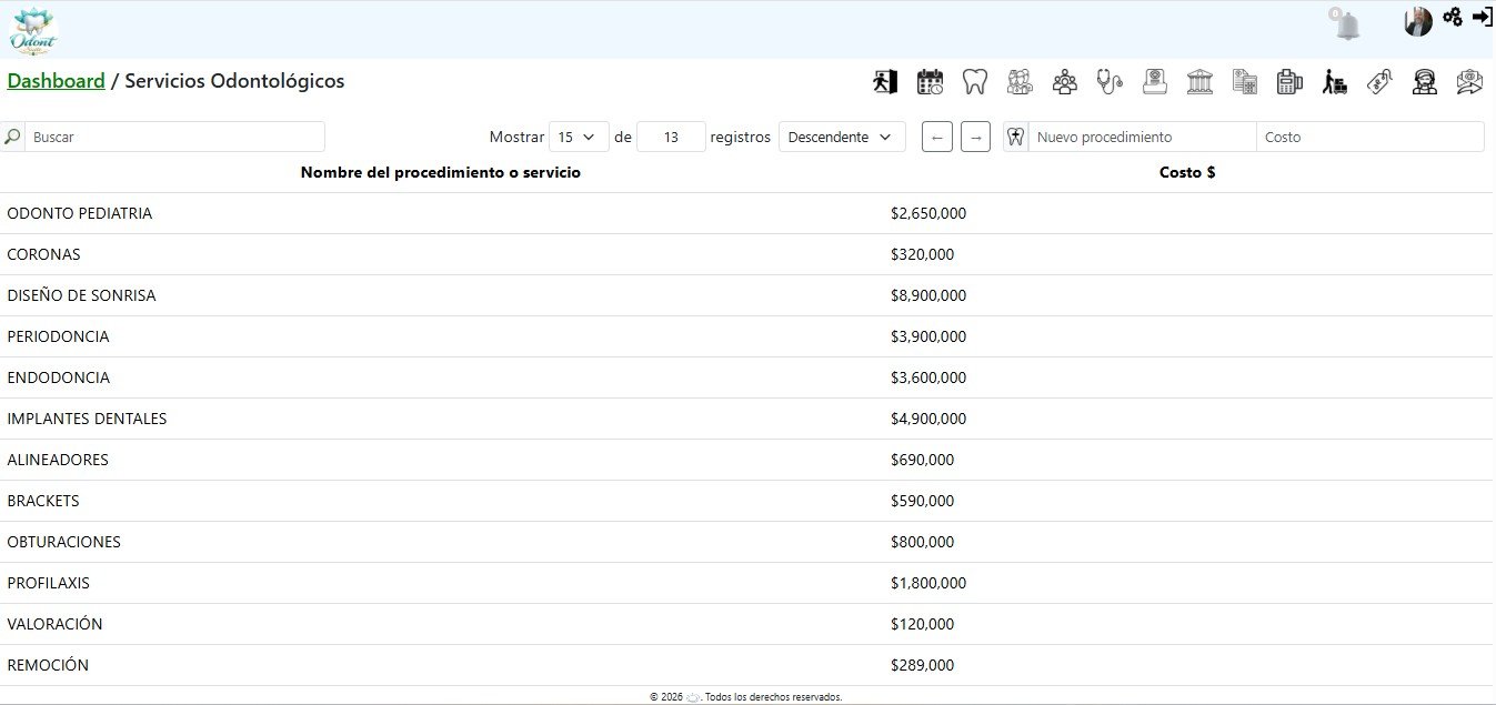 Esta información se integra de manera transversal con otros módulos del sistema, como estimaciones de tratamiento, facturación y gestión de proveedores, garantizando coherencia en los precios, optimizando la planificación financiera y facilitando el control administrativo de los servicios clínicos.